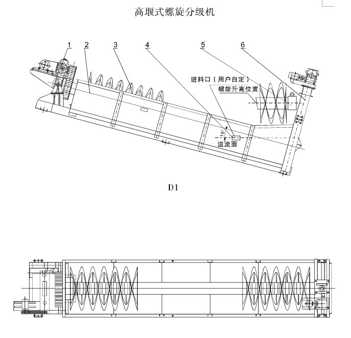 FG螺旋分級機結構及原理FC螺旋分級機大致相同(結構示意圖)。FG螺旋分級機的溢流堰位置高于螺旋軸下端的軸承中心,但低于溢流螺旋的上緣,具有一定的沉降區域,故適用于粗粒洗砂。而FC螺旋分級機溢流端的整個螺旋都浸沉在沉降區域液面下,其沉降區具有較大面積和深度,故適用于細粒洗砂。砂漿從位于沉降區中部的進料口入水槽,傾斜安裝的水槽下端是砂漿分級沉降區,螺旋低速轉動,對砂漿起攪拌作用,使輕細顆粒泥懸浮到上面,流到溢邊堰處溢出,粗重顆粒砂沉降到槽底,由螺旋輸送到排料口排出。